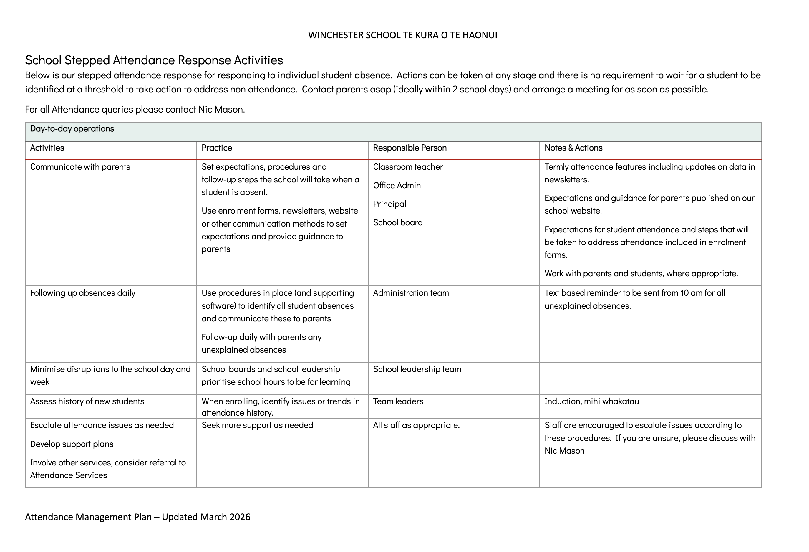 Below is our stepped attendance response for responding to individual student absence. Actions can be taken at any stage and there is no requirement to wait for a student to be identified at a threshold to take action to address non attendance. Contact parents asap (ideally within 2 school days) and arrange a meeting for as soon as possible.